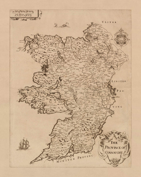 Die Karte ist eine detaillierte politische und physische Darstellung von Connacht und zeigt Straßen, Brücken, Städte, Dörfer, Bischofssitze und Erzbischofssitze, die im späten 17. Jahrhundert vorhanden waren. Hügel, Wälder, Flüsse, Seen und Loughs sind ebenfalls bildlich dargestellt, was eine lebendige und genaue Darstellung der Landschaft der Provinz bietet.