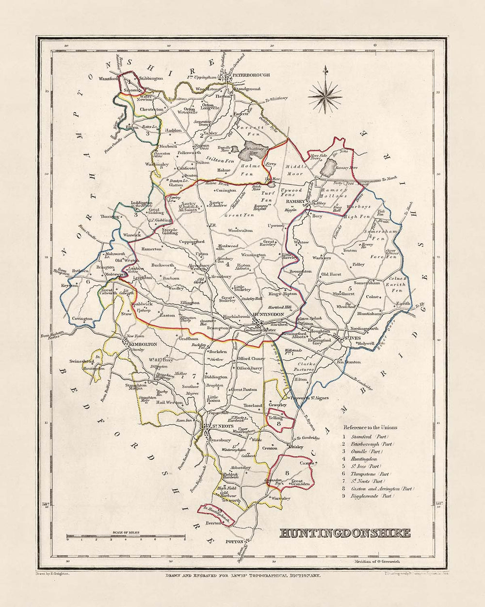 Alte Karte von Huntingdonshire von Samuel Lewis, 1844: St. Ives, St. Neots, Ramsey, Godmanchester und Kimbolton