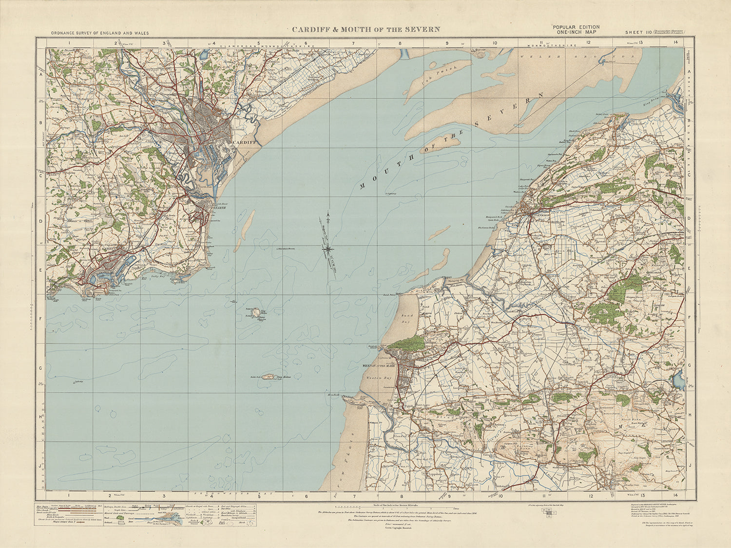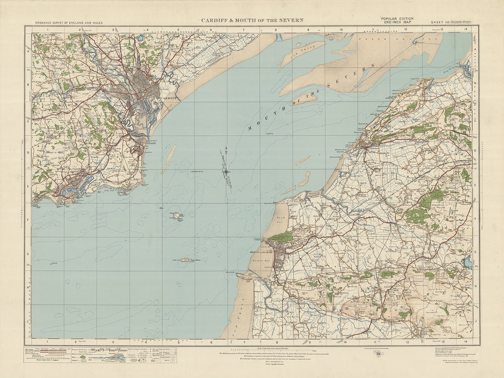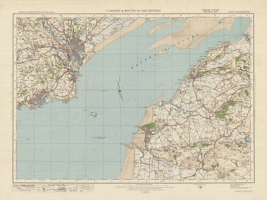 Diese alte Karte der Ordnance Survey, Blatt 110 – Cardiff & Mouth of the Severn, veröffentlicht im Jahr 1925, bietet einen faszinierenden Einblick in die Vergangenheit und zeigt die Städte und Naturmerkmale der Region. Die Karte deckt ein Gebiet ab, das Cardiff, die Hauptstadt von Wales, und die Mündung des Severn umfasst, und bietet eine einzigartige Perspektive auf die Landschaft und Siedlungen der damaligen Zeit.