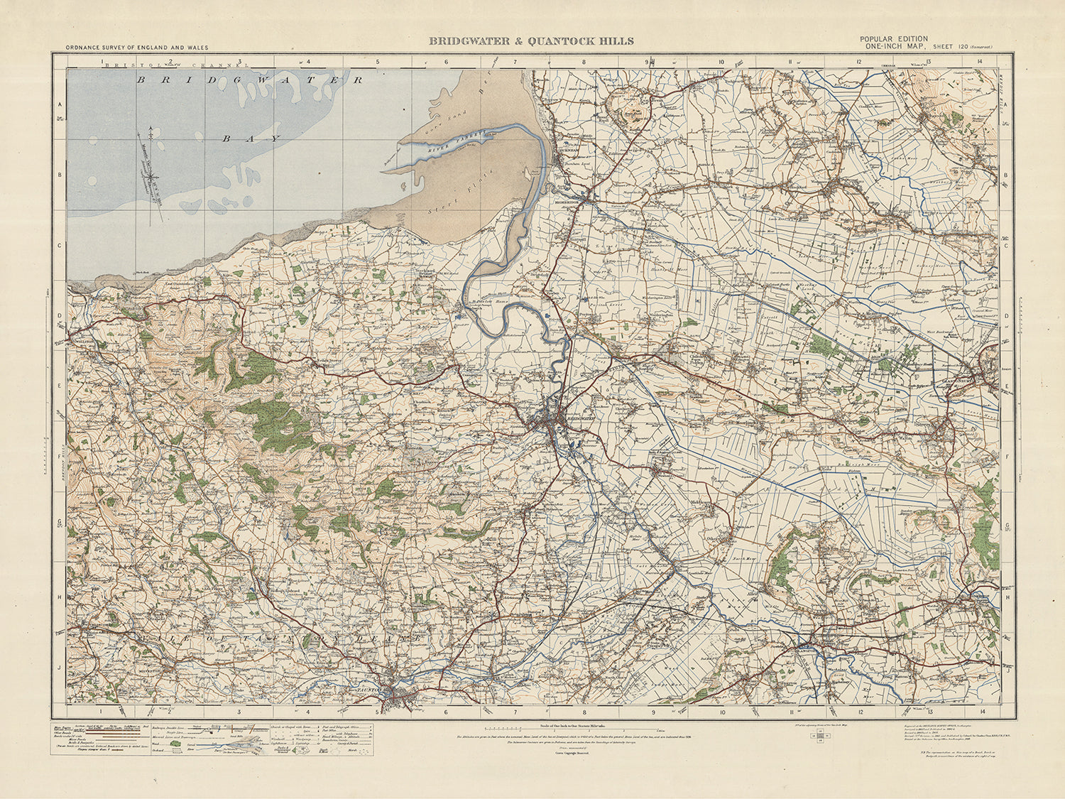 Tauchen Sie mit dieser fesselnden alten Ordnance Survey-Karte, Blatt 120 – Bridgwater & Quantock Hills, 1925, in die Vergangenheit ein. Entdecken Sie die Städte und Besonderheiten, die die Region geprägt haben, und gewinnen Sie ein tieferes Verständnis ihrer historischen Bedeutung.