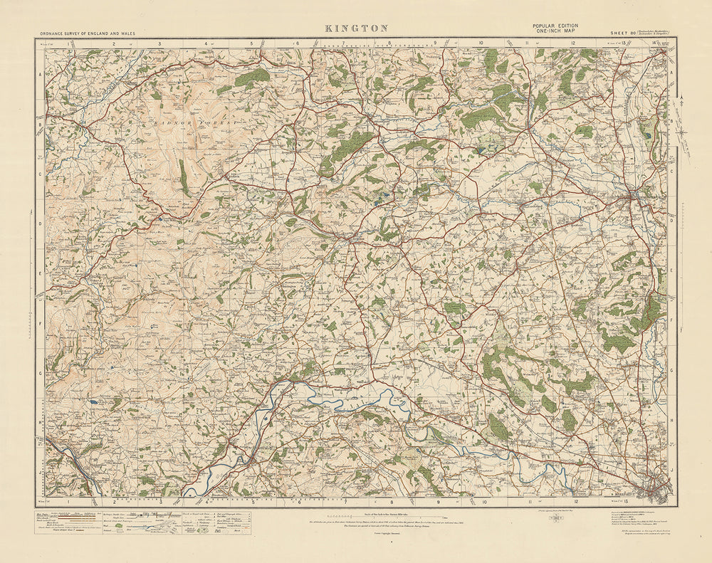Die Karte „Blatt 80 – Kington“ aus der One-Zoll-Ausgabe „Popular“ von Ordnance Survey, England und Wales, veröffentlicht 1925, ist ein faszinierendes Stück kartografischer Geschichte. Diese akribisch detaillierte Karte zeigt die Städte und interessanten Sehenswürdigkeiten der Region, darunter Kington, Leominster, Hereford, Presteigne, Hay-on-Wye und New Radnor.