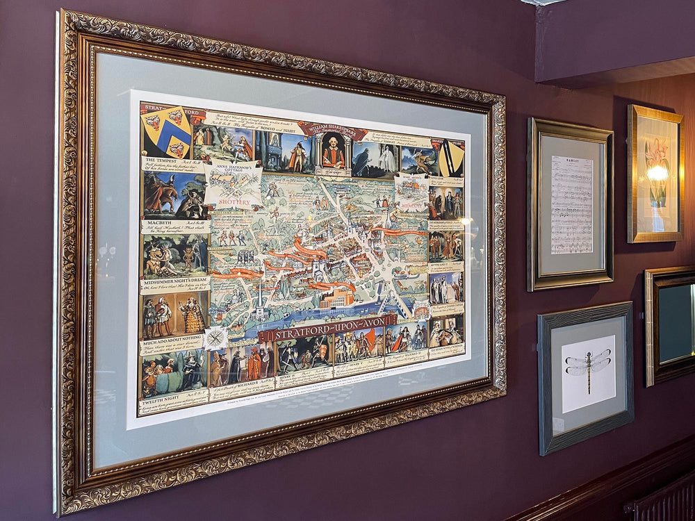 Die gesamte Karte konzentriert sich auf Shakespeares Leben in der Stadt - wo er lebte, wo er sich zurückzog, Illustrationen seiner Kinder, Freunde und seines Lehrers sowie andere lustige/interessante Anekdoten.