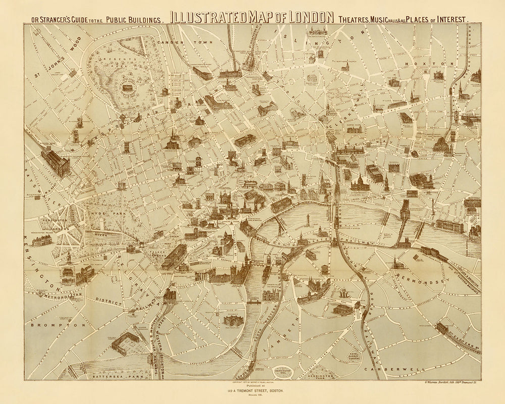 Der geografische Fokus der Karte umfasst ein Gebiet, das reich an Geschichte und Kultur ist, das sich von Kensington Palace im Westen bis zum Tower of London im Osten erstreckt und von Islington Green im Norden bis Kennington Oval und Park im Süden reicht. Diese Ausdehnung umfasst einige der ikonischsten Stadtteile Londons wie Kensington, Chelsea und Covent Garden, die jeweils mit einem Auge für Detail illustriert sind, das die viktorianische Ära zum Leben erweckt. Die Einbeziehung von Wahrzeichen wie den Royal Courts of Justice in der Mitte unterstreicht die Betonung der Karte auf Orten von rechtlicher, kultureller und historischer Bedeutung und bietet einen umfassenden Führer zum Herzen und zur Seele der Stadt.