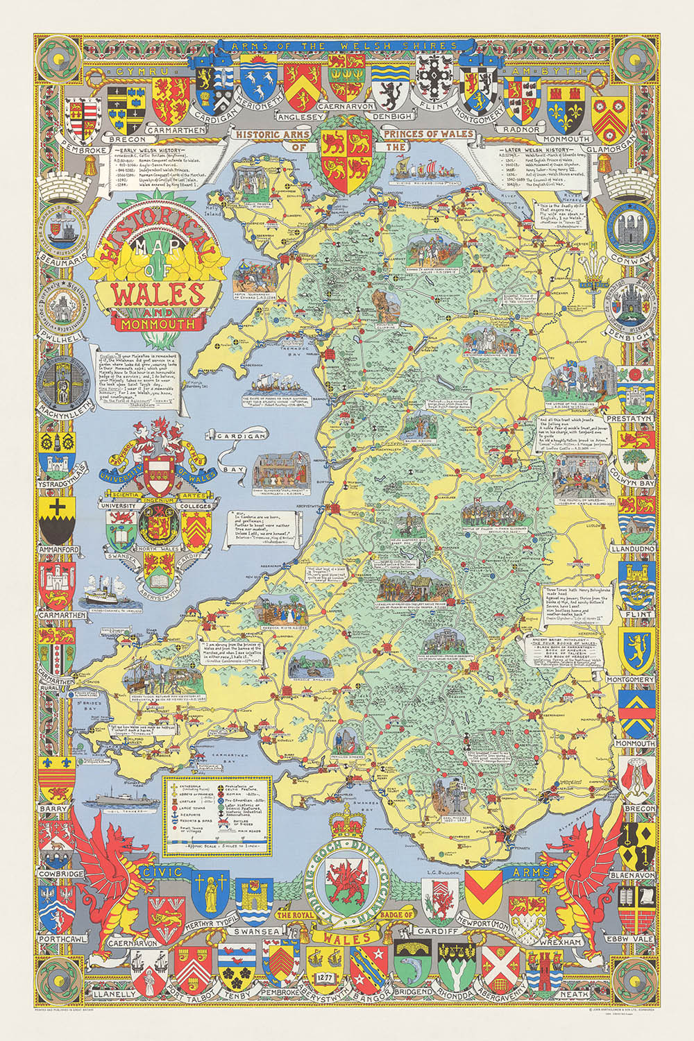 - Die Karte ist mit Illustrationen walisischer historischer Figuren und Ereignisse verziert.
