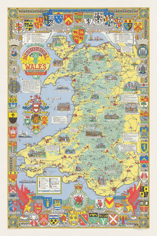 Tauchen Sie ein in das reiche Geflecht der walisischen Geschichte mit der "Historischen Karte von Wales", die 1966 sorgfältig vom renommierten britischen Kartografen LG Bullock erstellt wurde. Diese bildliche Karte ist nicht nur ein Leitfaden zur geografischen Anordnung von Wales, sondern ein lebendiges Portal in die Vergangenheit, das einen einzigartigen Einblick in die kulturelle und historische Landschaft dieser stolzen Nation bietet. Bullock, bekannt für seine Arbeit an der Serie "Shell County Road Maps", bringt seine akribische Liebe zum Detail und seine Leidenschaft für Geschichtenerzählen in dieses Meisterwerk ein. Die Karte ist geschmückt mit den Wappen der wichtigsten Städte und Ortschaften, neben denen der walisischen Clan- und Familienoberhäupter, jedes Emblem eine Geschichte von Erbe und Ehre.