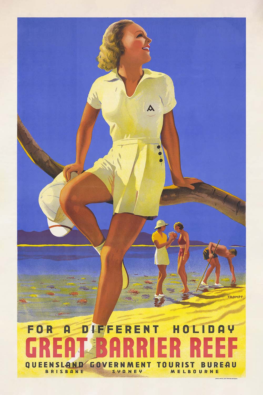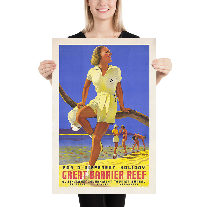 For a Different Holiday, Great Barrier Reef by Percy Trompf (1939) celebrates Queensland’s luminous coral coast at the height of Australia’s golden age of travel posters. Commissioned for the Queensland Government Tourist Bureau, Trompf’s design captures the breezy optimism of pre-war leisure: a smiling holidaymaker in a lemon-yellow playsuit perches on a leaning palm, looking toward a cobalt sky while the shallows below glint with coral-studded sand and tiny star-like motifs. Across the foot of the image, the rallying line “For a Different Holiday” anchors the scene and invites adventure on the world’s most famous reef.