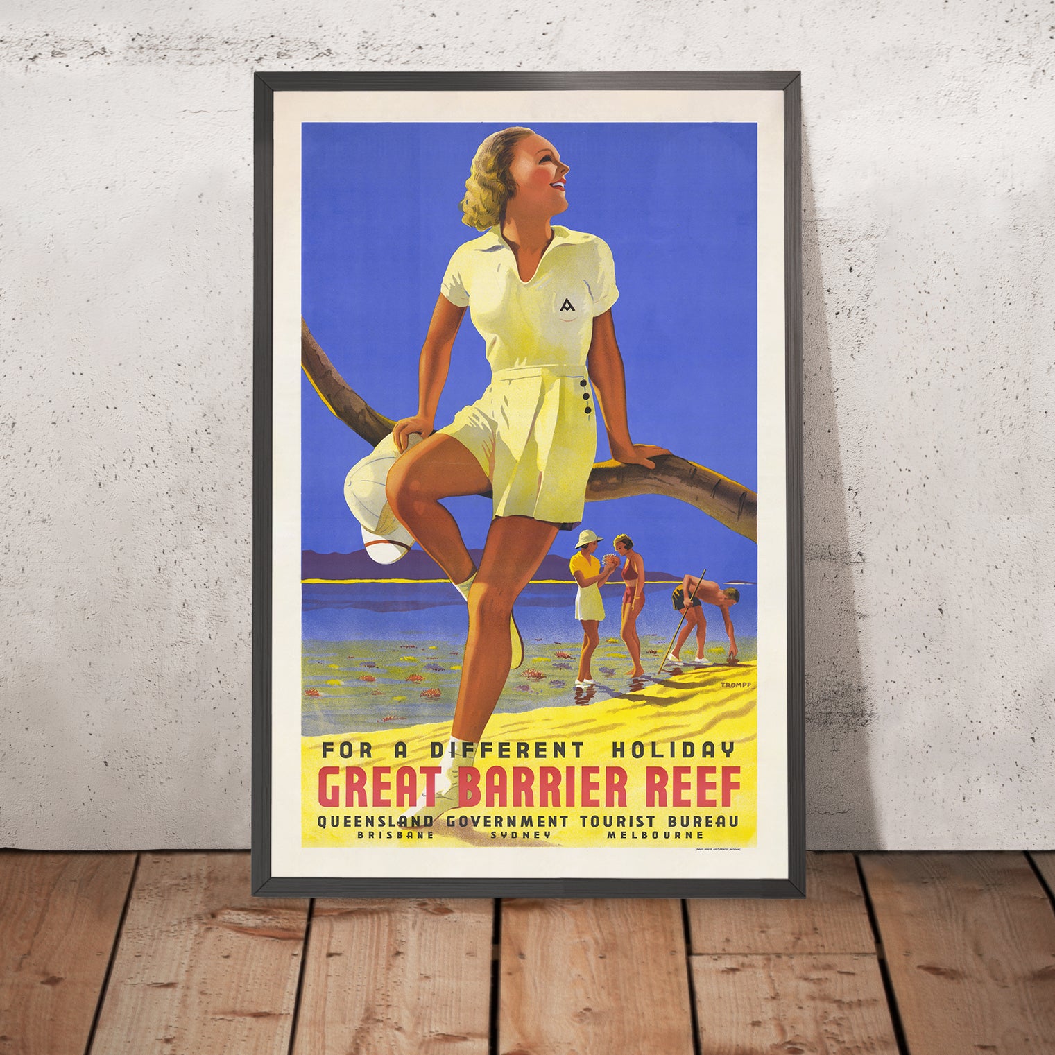Design lovers will appreciate how the composition balances sweeping forms and crisp type. The ultramarine sky and sea are set against sunlit yellows and warm beige sands; the red block lettering of “GREAT BARRIER REEF” pulses with energy without overpowering the scene. Trompf’s trademark flat color and soft airbrushed shading impart a timeless freshness—making this print an uplifting focal point for coastal, mid-century, or contemporary spaces.