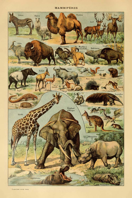 Diese Tafel zeigt eine außergewöhnliche Reihe von terrestrischen Säugetieren aus jedem Kontinent. Von majestätischen Giraffen und Elefanten bis hin zu grabenden Nagetieren und Beuteltieren spiegelt sie die zoologische Vielfalt wider, die im späten 19. Jahrhundert anerkannt wurde. Unten finden Sie eine Liste aller klar beschrifteten Arten mit ihren ursprünglichen französischen Namen und den gängigen englischen Entsprechungen.