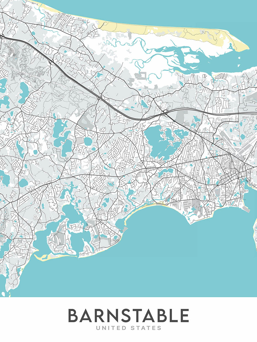 Die Karte umfasst neben der Stadt Barnstable auch die Städte Yarmouth und Dennis. Die Karte enthält auch viele der beliebtesten Sehenswürdigkeiten der Region, darunter den Barnstable Municipal Airport, den Barnstable Harbour, den Cape Cod Canal, Craigville Beach, Kalmus Beach, Long Beach, Sandy Neck Beach und West Dennis Beach.