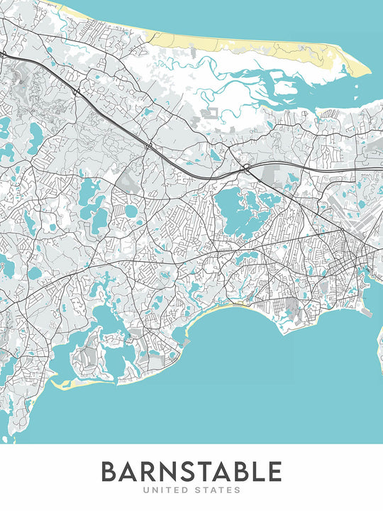Die Barnstable-Karte ist eine moderne, detaillierte Straßenkarte, die sich auf die Stadt Barnstable in Massachusetts konzentriert. Es ist ein wunderschönes und informatives Kunstwerk, das sich perfekt für jedes Zuhause oder Büro eignet. Die Karte deckt ein großes Gebiet ab, das sich etwa 9 Meilen nördlich und südlich des Stadtzentrums und 7,5 Meilen östlich und westlich erstreckt. Das bedeutet, dass die Karte viele der beliebtesten Viertel der Stadt umfasst, darunter Barnstable Village, Centerville, Cotuit, Hyannis, Hyannis Port, Marstons Mills, Osterville, West Barnstable und Yarmouth Port.