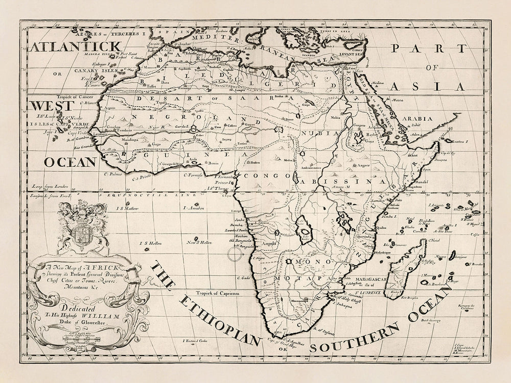 Die Standorte auf dieser Karte umfassen: Ägypten, Kongo, Kanarische Inseln, Arabien, Madagaskar, Nubien, Guinea, Sahara und Negroland.
