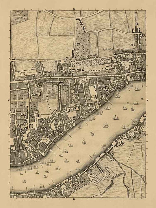 Diese Karte wurde ursprünglich in 24 Blättern veröffentlicht. Die hier gezeigte Karte ist das Blatt G2, das sich auf den Teil der Themse konzentriert, der Wapping und Shadwell auf der Nordseite und ein kleines Stück Rotherhithe auf der Südseite hat. Sie umfasst Teile von Tower Hamlets und Southwark sowie einen großen Abschnitt der Themse.