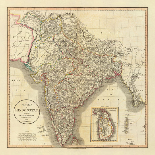 Die Karte 'Hindoostan & Ceylon' ist eine prächtige Darstellung von Carys unverwechselbarem Stil, der kartografische Genauigkeit mit ästhetischer Anziehungskraft kombiniert. Die Karte zeigt ein detailliertes politisches und physisches Layout, wobei die politischen Grenzen klar abgegrenzt und die physischen Merkmale wie Berge und Flüsse sorgfältig gezeichnet sind. Die Karte zeigt auch die Insel Ceylon, die heute als Sri Lanka bekannt ist, sowie die Andamaneninseln und bietet einen umfassenden geografischen Überblick über die Region.