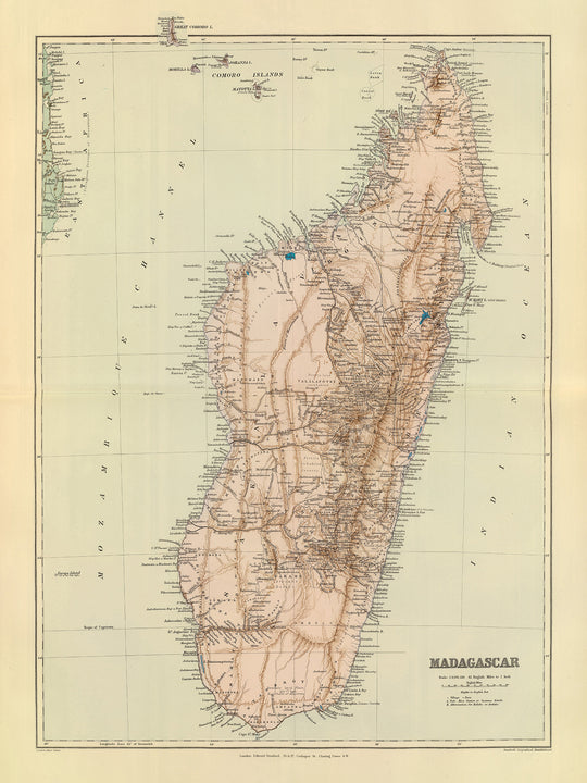 Diese wunderschön detaillierte antike Karte von Madagaskar von Edward Stanford, veröffentlicht im Jahr 1901, bietet einen faszinierenden Einblick in die Geographie und Geschichte der Insel zu Beginn des 20. Jahrhunderts.