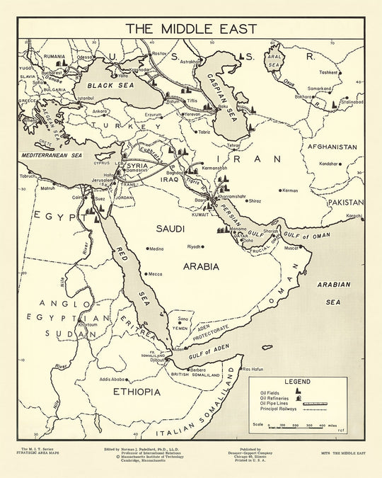 Betreten Sie das reiche historische Gefüge des Nahen Ostens mit dieser sorgfältig gestalteten Karte von 1950, erstellt von dem angesehenen Norman J. Padelford, Ph.D., LL.D., einem Professor für Internationale Beziehungen am MIT. Diese Karte ist Teil der Reihe strategischer Gebietskarten des Massachusetts Institute of Technology, die dazu dient, Studenten über die geopolitischen und wirtschaftlichen Landschaften kritischer Regionen aufzuklären. Sie fängt die frühen Phasen der Ölindustrie im Nahen Osten ein, einem Sektor, der bald zu einem Grundpfeiler der globalen Energieproduktion und internationalen Beziehungen werden sollte.