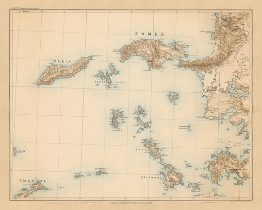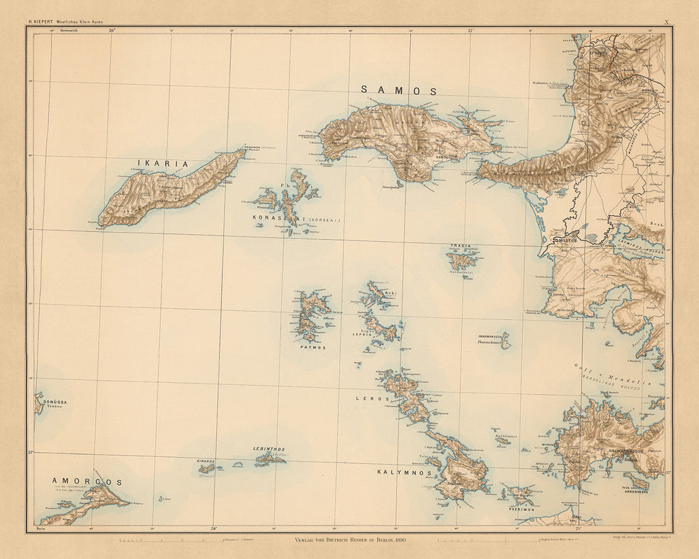 Alte Karte von Samos & Ägäis-Inseln von Kiepert, 1890: Ikaria, Kalymnos, Fournoi, Ephesus