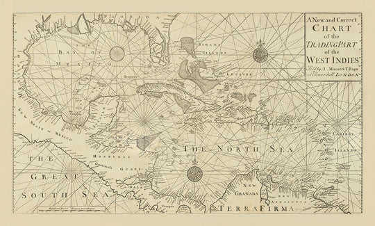 Diese Karte zeigt die Westindischen Inseln, wie sie vor fast 300 Jahren waren! Schauen Sie sich all die Inseln vor der Küste von Mittelamerika an, die vom Nordatlantik, Golf von Mexiko und der Karibik umgeben ist.