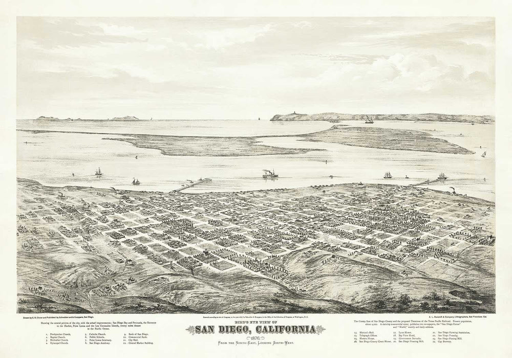 Das 'Auge' der Karte sitzt grob auf dem Cortez-Hügel und schaut südwestlich über die Stadt in Richtung Bucht. Alle Original- und nummerierten Straßen der Innenstadt von San Diego sind auf dieser Karte eindeutig zu sehen - sie waren immer noch dort, wo sie vor fast 150 Jahren festgelegt wurden.