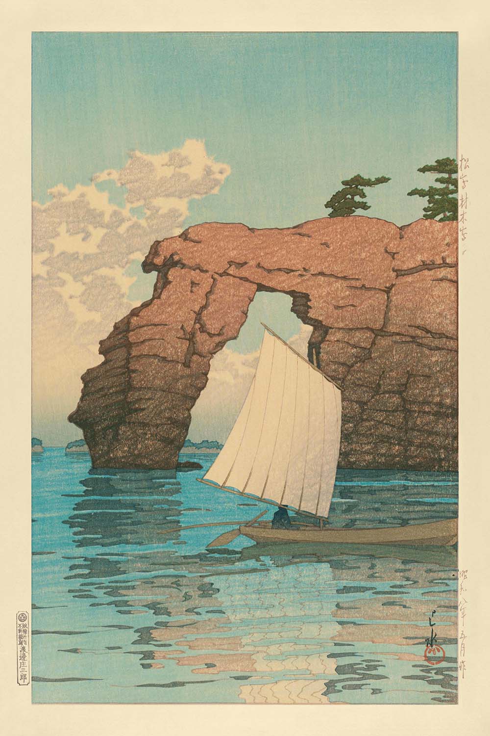 Hasui Kawase war ein Vorreiter der Shin-Hanga-Bewegung, die westliche Stilelemente in den traditionellen japanischen Holzschnitt einführte. Seine Werke zeichnen sich durch ruhige und friedliche Landschaften aus, die ein tiefes Gefühl von Frieden und Gelassenheit hervorrufen. Bekannt für seine Fähigkeit, subtile Lichtkontraste und atmosphärische Effekte einzufangen, transportieren Kawases Drucke die Betrachter in poetische Momente der Reflexion.