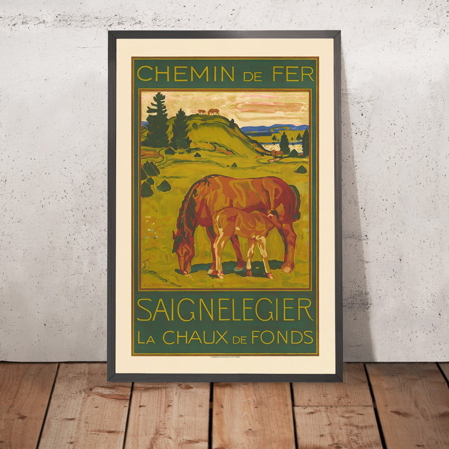 Chemin de fer – Saignelégier – La Chaux-de-Fonds by Charles l’Eplattenier (1932) captures the high Jura between the hilltop town of Saignelégier and the watchmaking hub of La Chaux-de-Fonds in western Switzerland. Designed at the height of the golden age of rail posters, it invites the traveler up onto the Franches-Montagnes plateau with its open pastures and dark conifer belts. In the composition, broad, pine-dark bands of forest step down the slopes in rhythmic layers, set against ochre meadows and a pale, parchment-toned sky, while the French title anchors the scene in bold block lettering along the foot of the sheet.