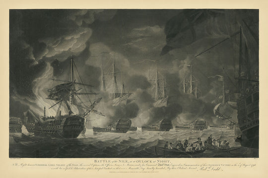 "Schlacht am Nil, um 10 Uhr nachts, An den ehrenwerten Admiral Lord Nelson vom Nil..." von Robert Dodd ist eine ikonische Darstellung einer der entscheidendsten Seeschlachten in der Geschichte. Diese dramatische Aquatinta, veröffentlicht 1799, fängt die Intensität der Schlacht in der Nacht des 1. August 1798 ein und illustriert die kritischen Momente der britischen Flotte unter Horatio Nelson gegen die Franzosen.