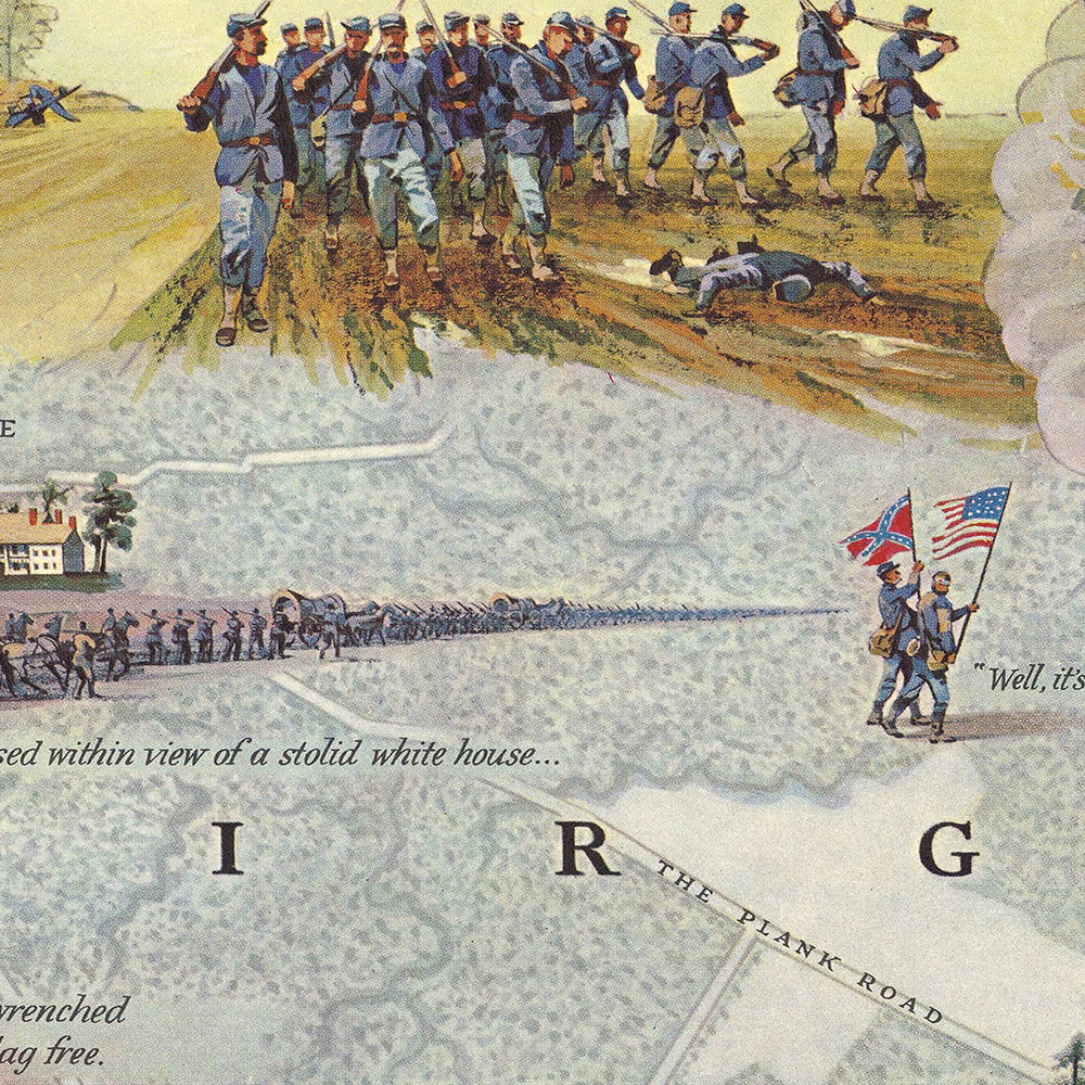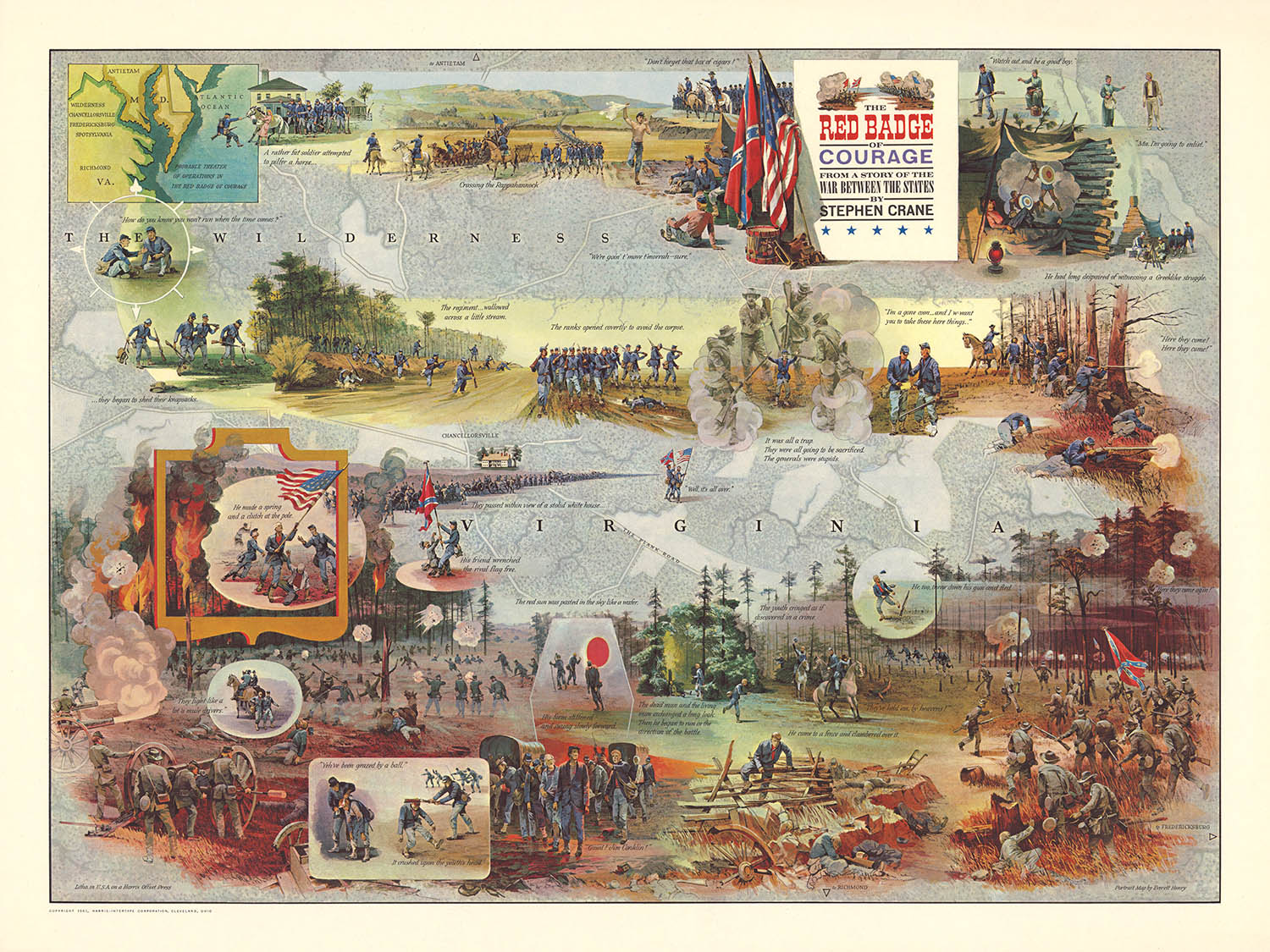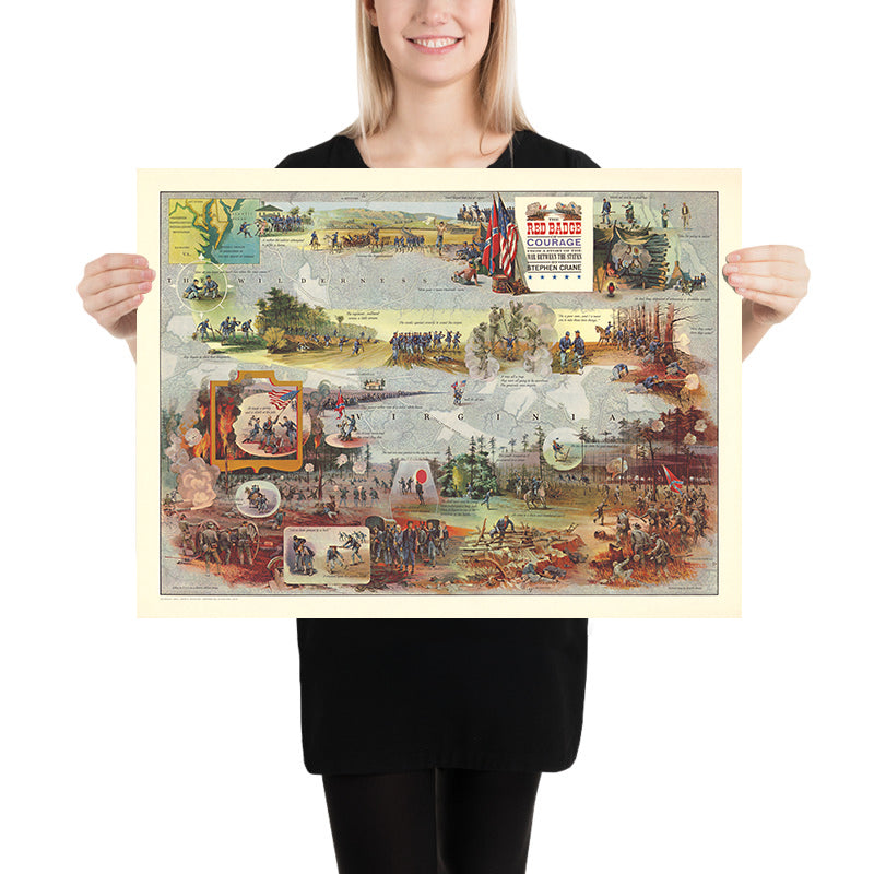 Crane’s novel is a touchstone of American literature for its unflinching portrait of a young Union soldier’s inner life. Henry’s poster honors that achievement by scattering episodic scenes across Civil War Virginia: marching columns dissolve into smoke, skirmish lines break through pine woods, and quiet bivouacs punctuate the chaos. An inset map of the Eastern Theater and the large, pale letters spelling “VIRGINIA” in the background ground the narrative geographically while keeping the focus on the human drama.