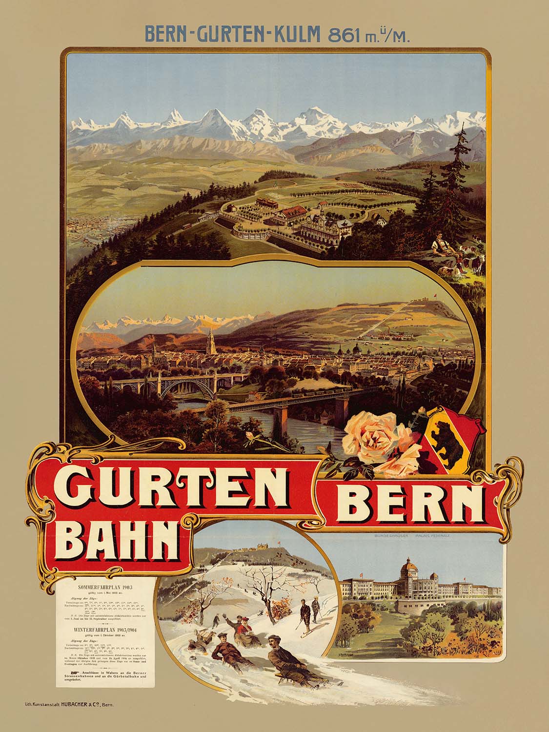 Gurten-Bahn Bern by Anton Reckziegel (1903) is a luminous slice of the golden age of Swiss travel—when a day’s excursion by funicular could promise alpine air, panoramic city views, and the romance of modern engineering. Created at the height of the Art Nouveau era, the poster celebrates the Gurten, Bern’s beloved local mountain, and the sleek Gurtenbahn that whisks visitors from the city’s edge up to meadows and outlook points over the Aare and the old town’s rooftops. With flowing ornament, heraldic details, and a rich, scenic panorama, Reckziegel makes a compelling case for Bern as both gateway to the Alps and a destination in its own right.