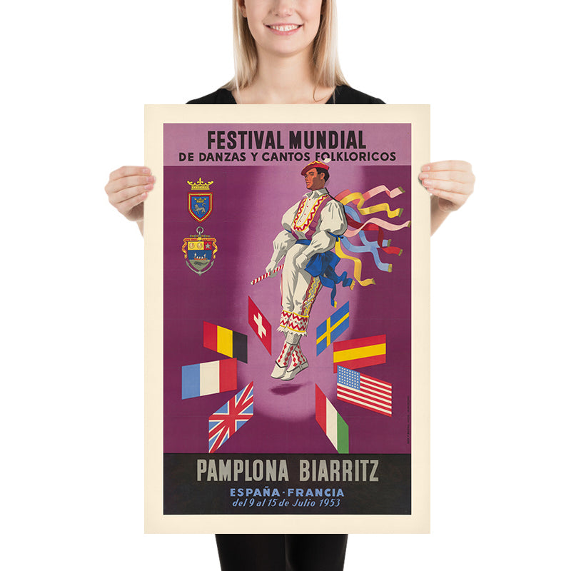 Pamplona & Biarritz Travel Poster: Festival Mundial de Danzas y Cantos Folklóricos, 1953