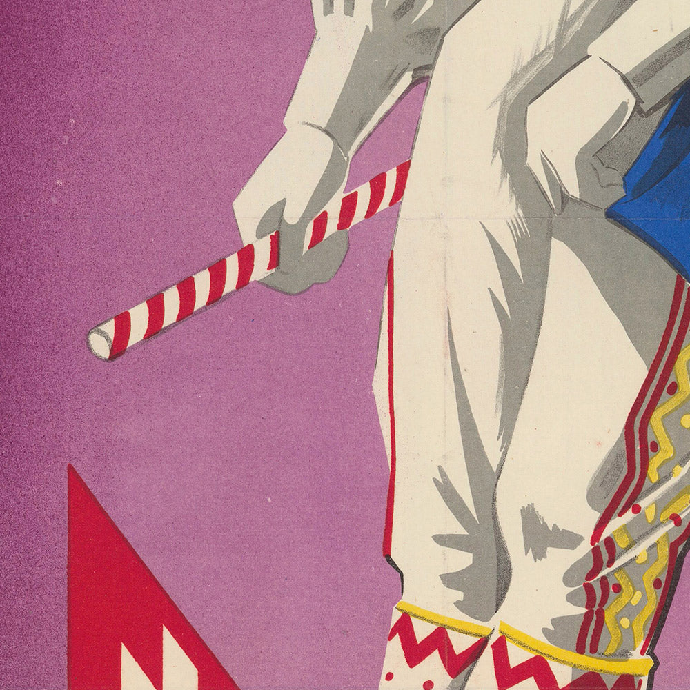 Design lovers will appreciate the way the limited palette heightens impact: the plush purple base holds the eye, while red accents energize the composition and blue notes cool and balance it. The mid-century layout feels crisp and modern even now, and the warm, slightly cream-toned highlights evoke the tactile charm of vintage paper. It’s a piece that brings both cultural history and graphic sophistication to a room—ideal over a console, in an entryway, or as the focal point of a gallery wall.