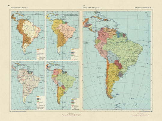 - Fünf Insetzkarten zeigen die koloniale Entwicklung Südamerikas von 1500 bis 1600, die kolonialen Besitztümer vor den Unabhängigkeitskämpfen 1810, den Rückgang des Kolonialismus von 1811 bis 1830, den Ausbruch des Ersten Weltkriegs 1914 und die aktuellen Landkreise 1966.