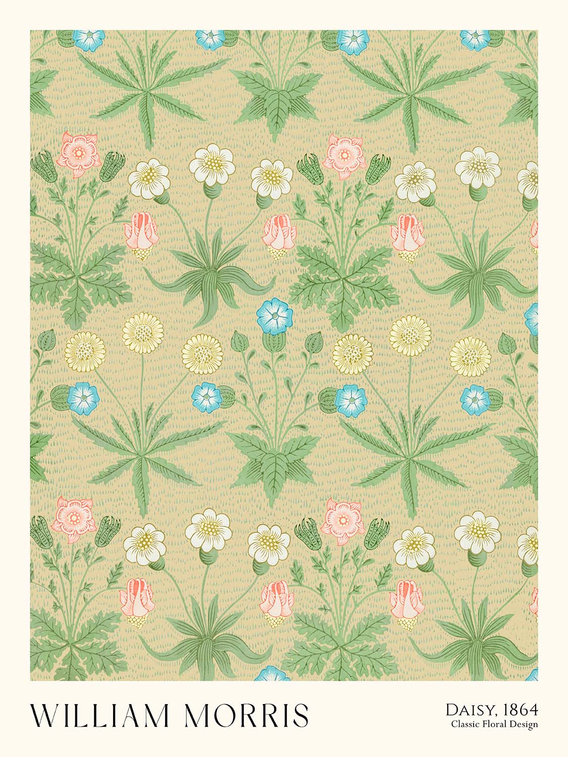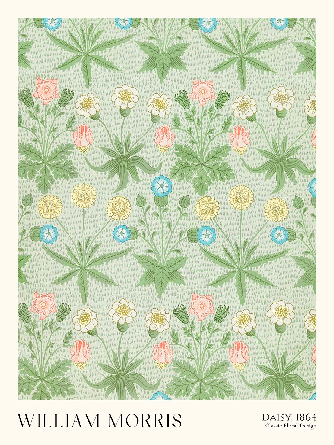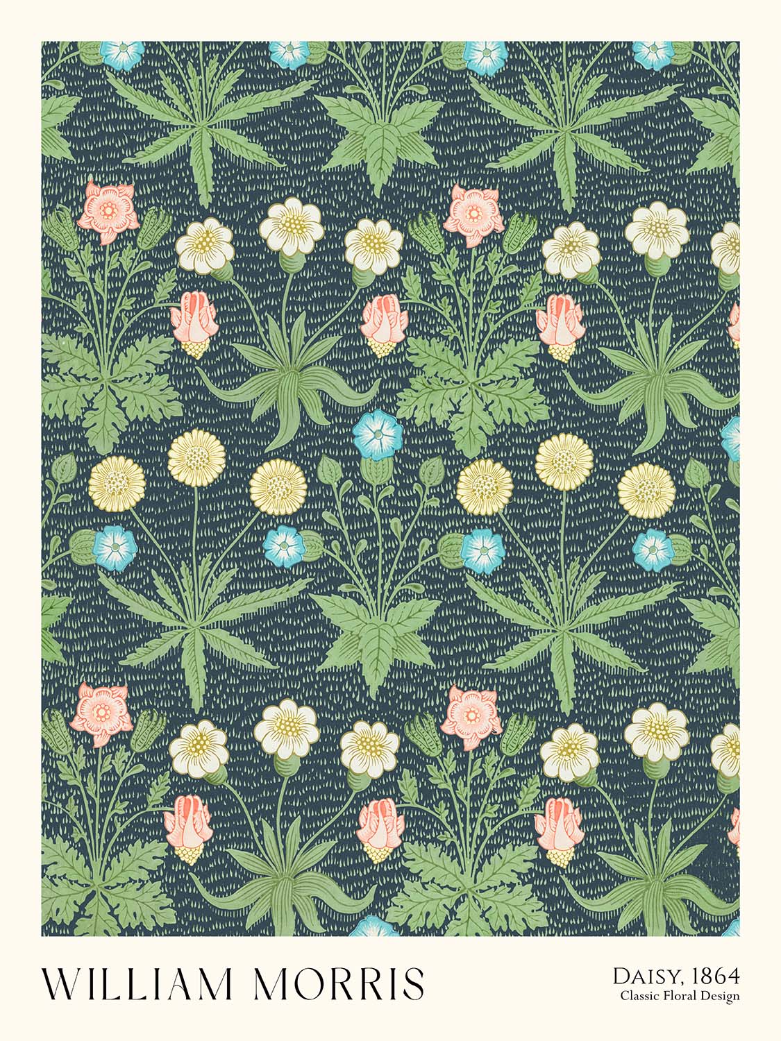 Daisy stands at the beginning of Morris’s lifelong dialogue with the garden and hedgerow. Its floral repeat evokes the informal charm of English meadow flowers while translating them into a legible, orderly structure—an approach that balanced natural observation with stylized geometry. In the late 19th century, this was radical: a humane, nature‑led alternative to machine‑made excess, and a blueprint for domestic harmony through design.
