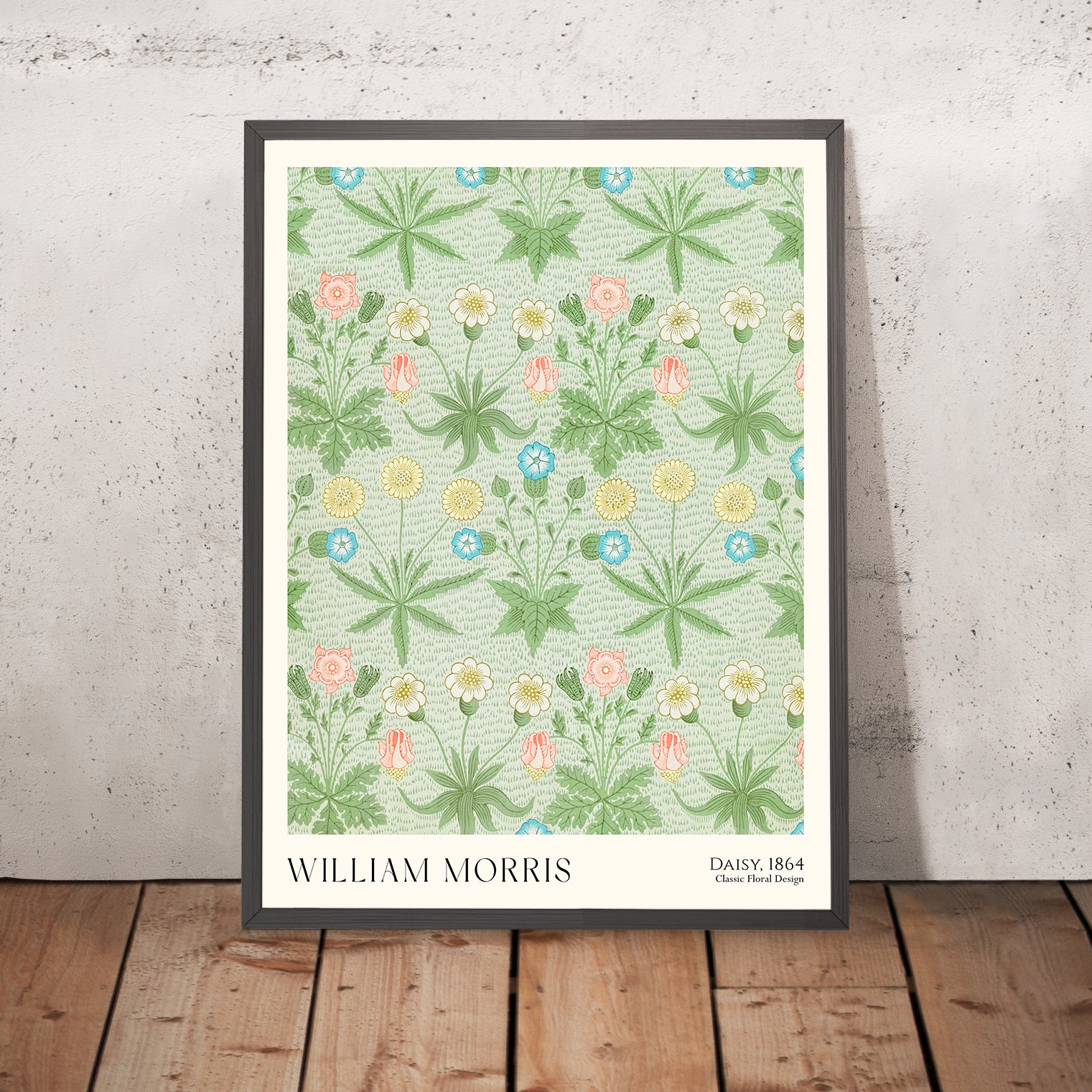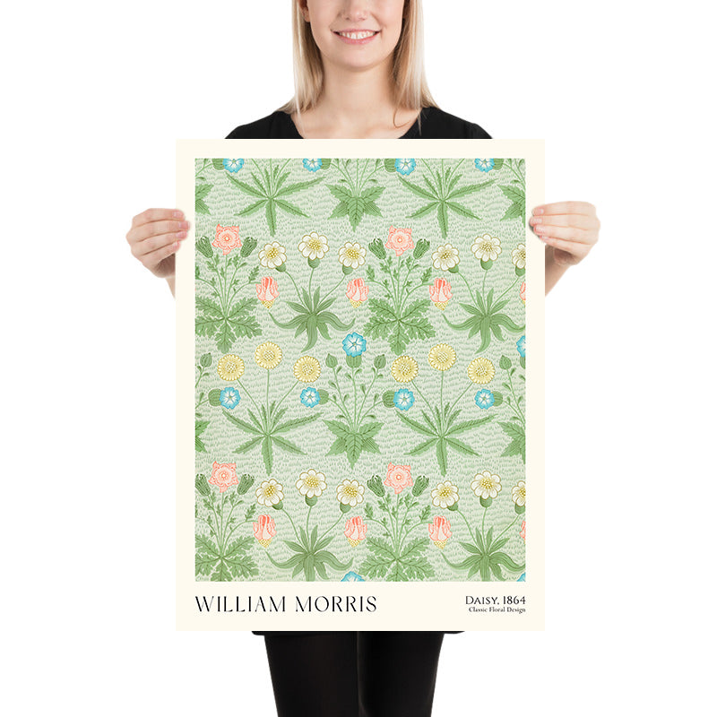 Daisy by William Morris (1864) is a quintessential Arts & Crafts pattern, revived here as a restored, high‑quality fine art print. Most likely conceived as a wallpaper, the design’s adaptable, allover repeat would also have suited carpets, curtains, or other textiles. Its motif of meadow daisy heads (Bellis perennis) unfurls across a rhythmic field of intertwining stems and leaves, capturing the movement’s devotion to nature, hand drawing, and honest ornament.