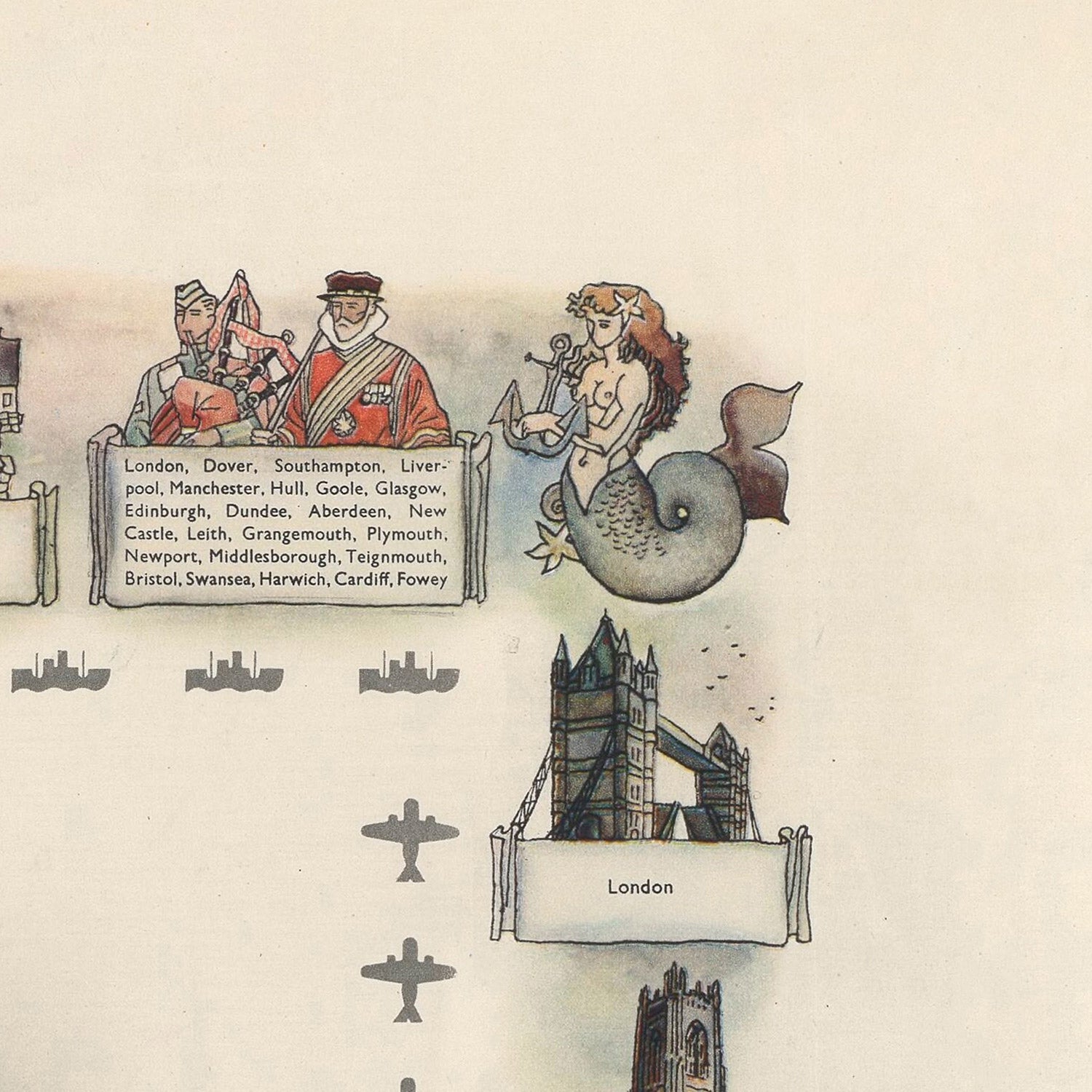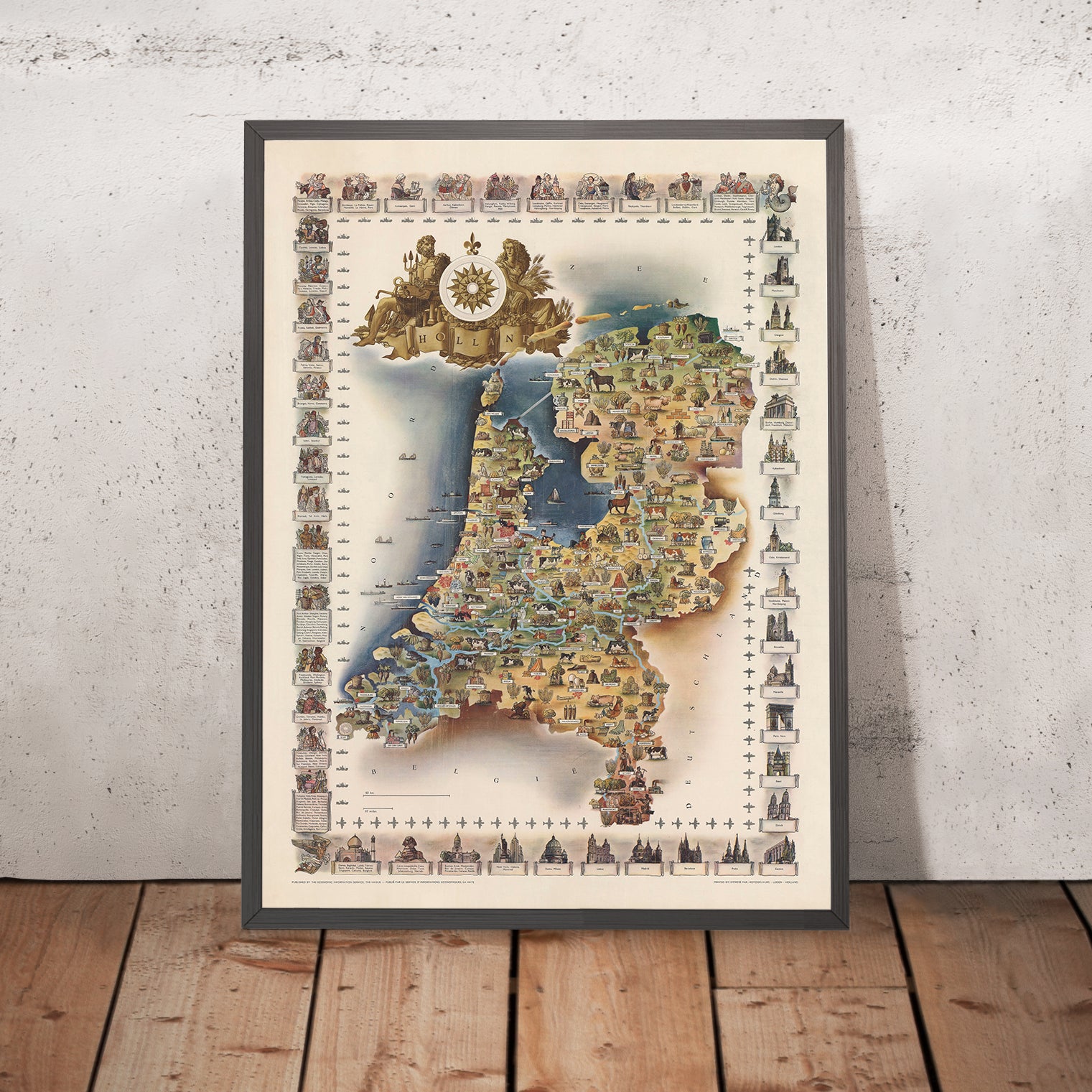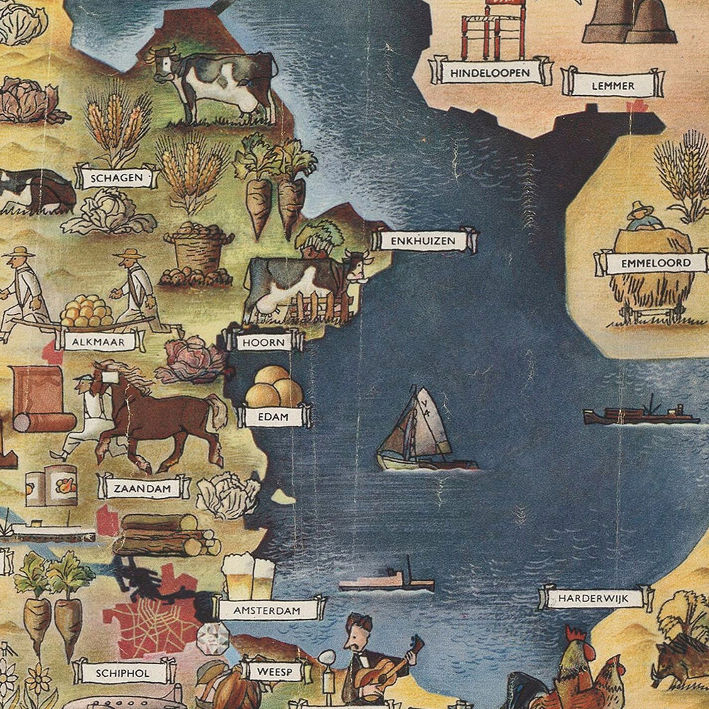 Although the original artist’s name is unrecorded, the hand is unmistakably that of a skilled studio illustrator working in the postwar travel boom. At the time, tourist boards, railways, and regional publishers frequently commissioned such illustrated maps to entice visitors and convey a sense of national optimism. Here, confident linework and a joyful narrative of scenes—ranging from coastal life to inland traditions—transform the Netherlands into a storybook of places to discover.