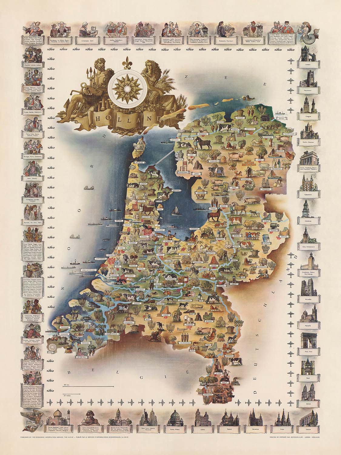 Holland, created in 1950 by an artist now lost to history, is a joyous mid-century travel poster in the grand tradition of the pictorial map. It blends geography with storytelling, guiding the eye across the Low Countries with lively vignettes that celebrate Dutch life, heritage, and the intricate relationship between land and water. While its spirit is confidently modern, the illustrative approach nods to 19th-century cartography, when maps often doubled as cultural showcases—an ideal match for a nation renowned for maritime trade, engineering prowess, and a kaleidoscope of regional customs.