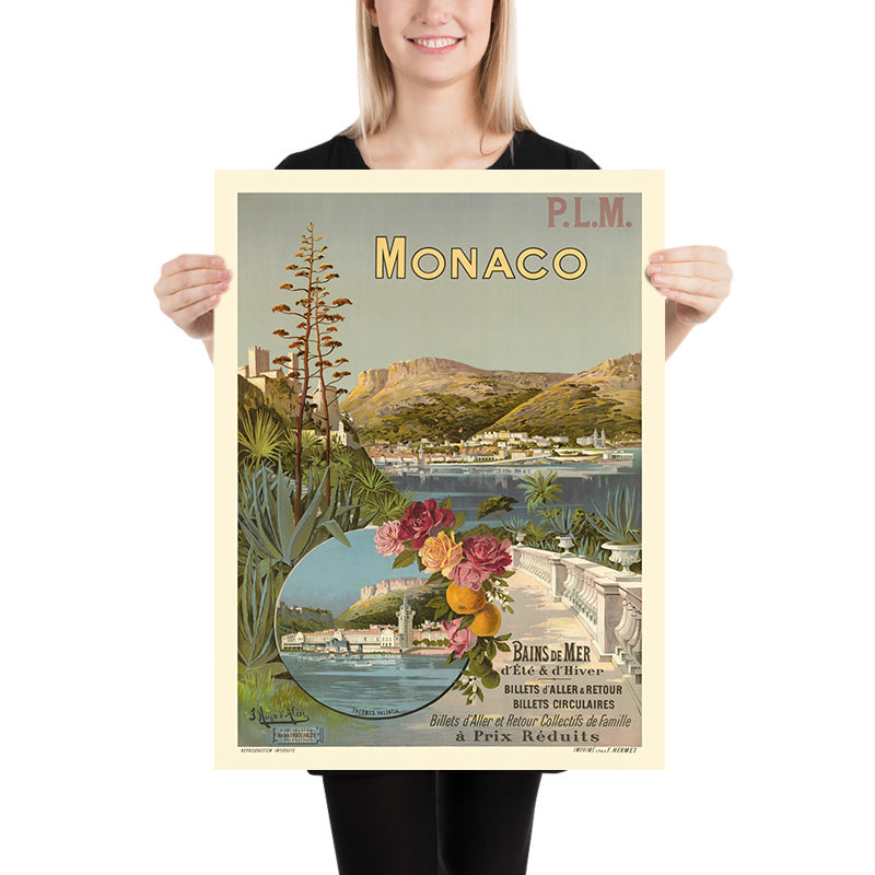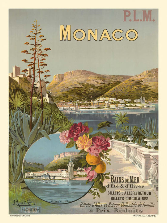 P.L.M. Monaco. Bains de mer d’Eté & d’Hiver by Frédéric Hugo d’Alési (1896) captures the golden age of Riviera travel with lyrical Art Nouveau grace. Created to entice rail passengers to the Principality, this elegant poster celebrates Monaco’s year‑round appeal—summer and winter sea bathing—set against the soft light of the Mediterranean. Floral garlands frame a circular vignette of coast and gardens, while slender architectural lines rise through the scene, evoking the glamour and poise that made the French Riviera a legend.