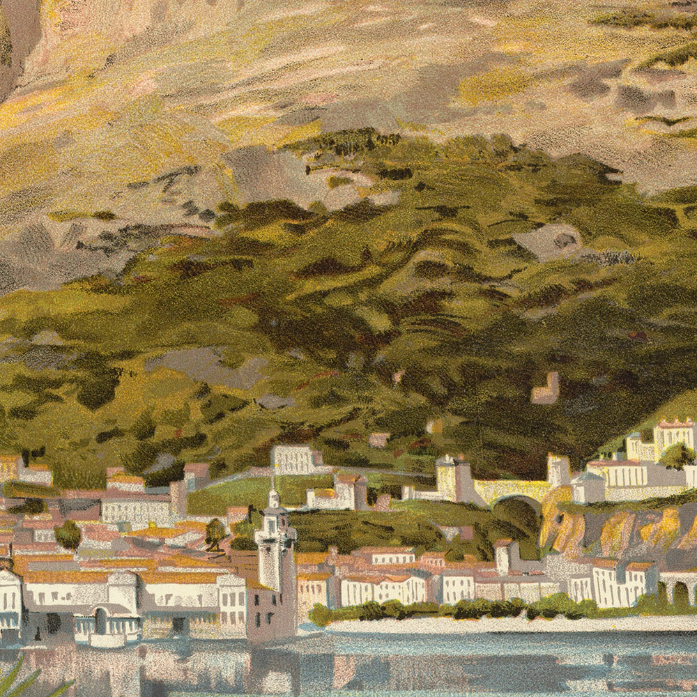 Color, style, and design: A tranquil palette of Mediterranean blues and sea greens anchors the composition, softened by sandy beige tones and gentle warm pinks that glow like evening light on stone and stucco. Art Nouveau flora curl and climb at the edges, their sinuous stems and blossoms guiding the eye into the central view. Vertical elements lend elegance and lift, while the lithographic gradients yield a velvety depth that feels both romantic and refined. The result is a calming, luminous statement piece—ideal for lovers of coastal interiors, Belle Époque design, and classic railway art.