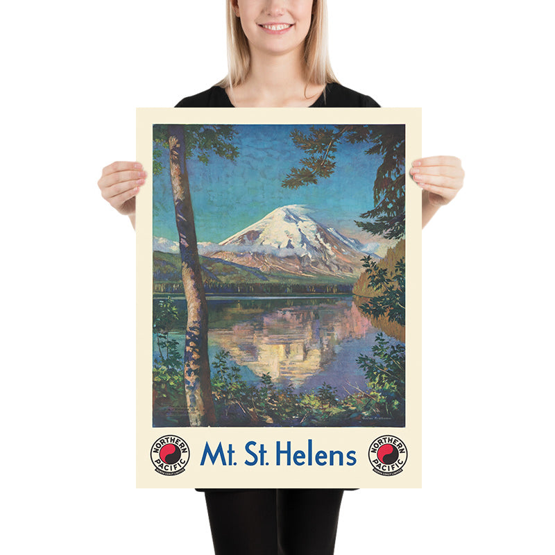 Mt. St. Helens Northern Pacific North Coast Limited by Gustav Wilhelm Krollmann, published in 1920, captures the Pacific Northwest at its most serene and inviting. A mirror-still lake leads the eye toward the snow-capped cone of Mount St. Helens, its white summit gleaming against a sky of layered blues, while ranks of evergreen trees frame the scene in rich greens. Created as a promotional travel poster for the Northern Pacific’s celebrated North Coast Limited, this design blends the clarity of early twentieth-century American poster art with the regional pride that would soon characterize American Regionalism—an affectionate, realistic attention to place that invites viewers into the landscape.