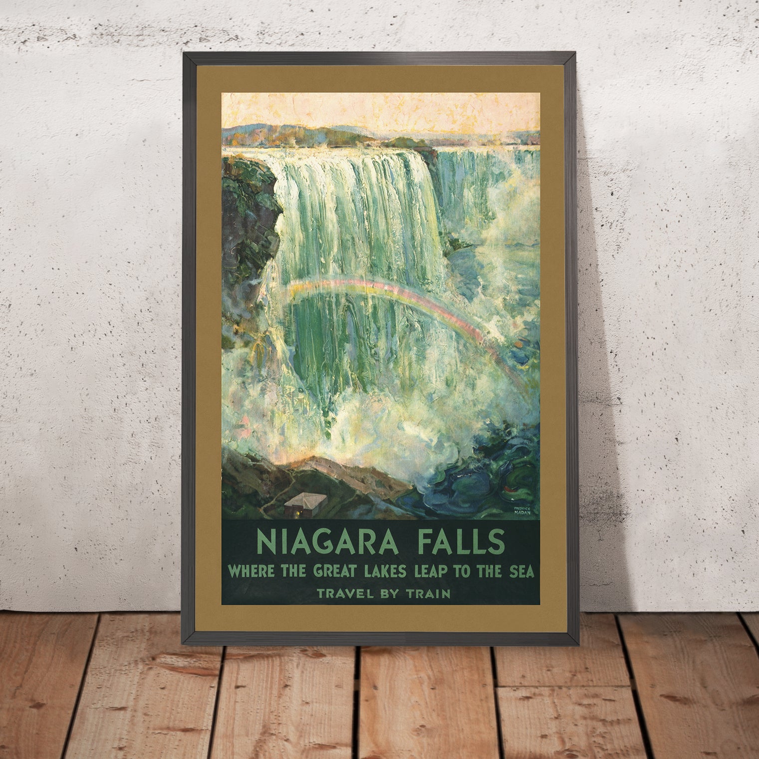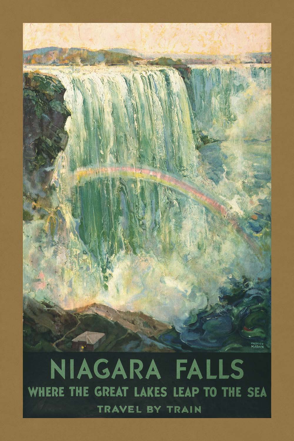 Niagara Falls, where the Great Lakes leap to the sea by Frederic C. Madan (1925) is a quintessential early 20th-century travel poster celebrating one of North America’s most iconic natural wonders. Issued at a time when rail travel opened up the continent to leisure tourism, it captures the vast curtain of water, rising mist, and a delicate rainbow that arcs through the spray. The title’s evocative phrase nods to geography: the Niagara River carrying the waters of the Great Lakes toward the Atlantic, transforming sheer movement into spectacle.