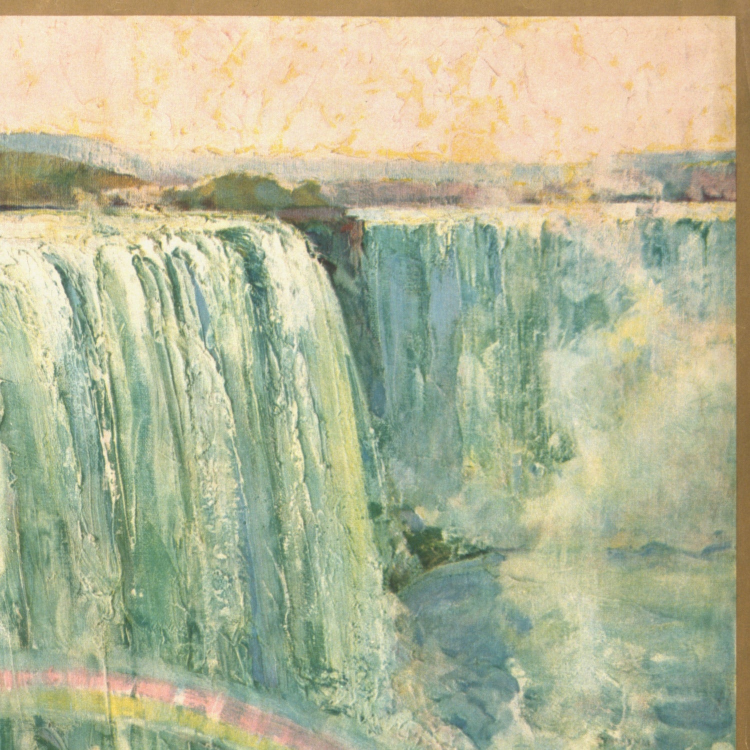 Design and color: The poster’s palette is led by greens, blues, and luminous whites, with soft earth tones anchoring the riverbanks. Flowing, Art Nouveau-inspired lines trace the descent of the water, while broader, poster-style shapes give the scene its bold legibility from afar. A prismatic rainbow softens the composition, and the mist, rendered in airy whites and pale blues, diffuses light to create a dreamy, almost Impressionistic atmosphere. It’s a piece that manages both serenity and grandeur—equally compelling above a mantel, in a hallway, or in a contemporary living room where its cool greens and blues bring freshness and calm.