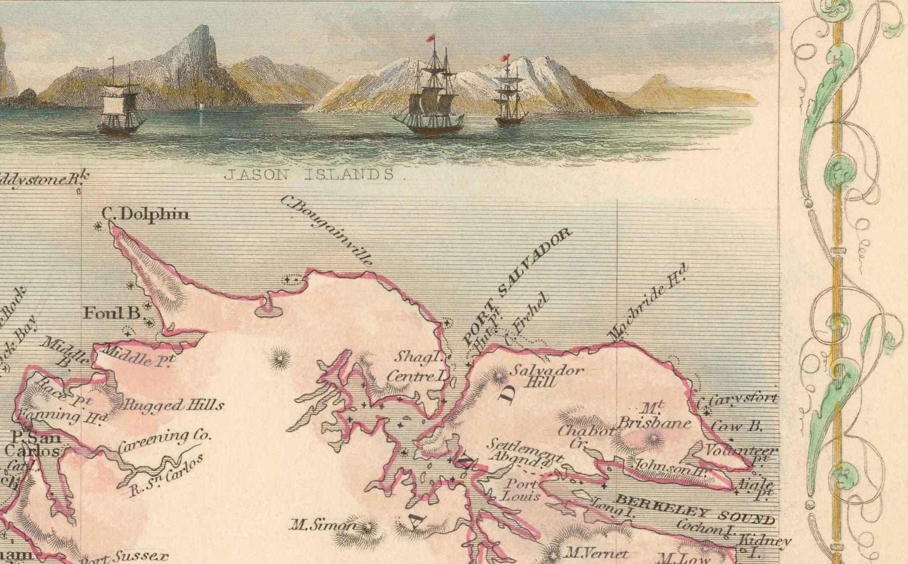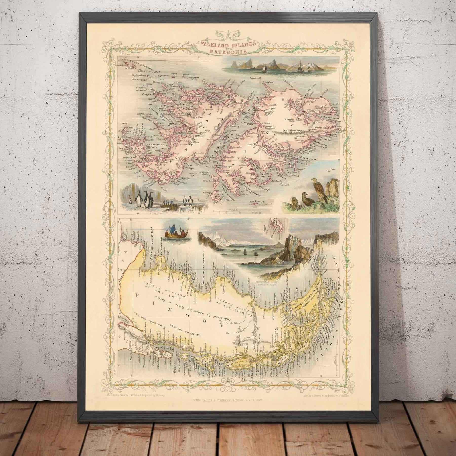 Graviert von John Rapkin und veröffentlicht von J. Tallis & Co im Jahr 1851, ist dies eine der schönsten und detailliertesten historischen Karten der Falklandinseln und Patagoniens.