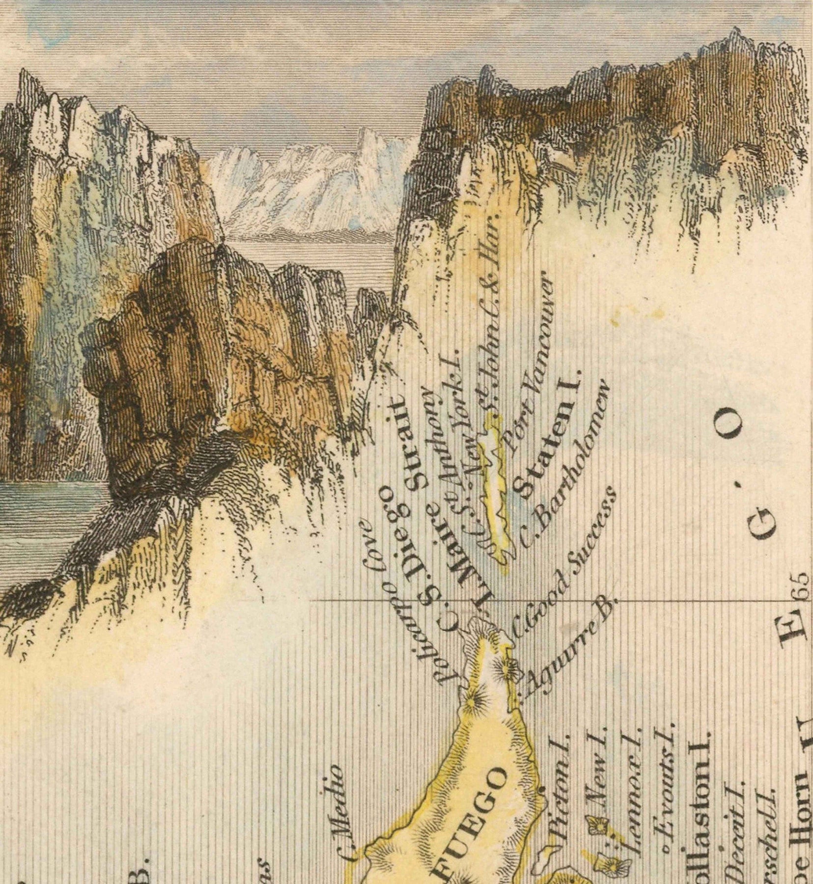 Diese Karte zeigt die Falklandinseln (Malvinas) im großen Detail und auch die südlichsten Ausläufer Südamerikas. Feuerland wird hier gezeigt, ebenso das Kap Hoorn. Patagonien selbst soll 'von umherziehenden Indianerstämmen bewohnt sein'...