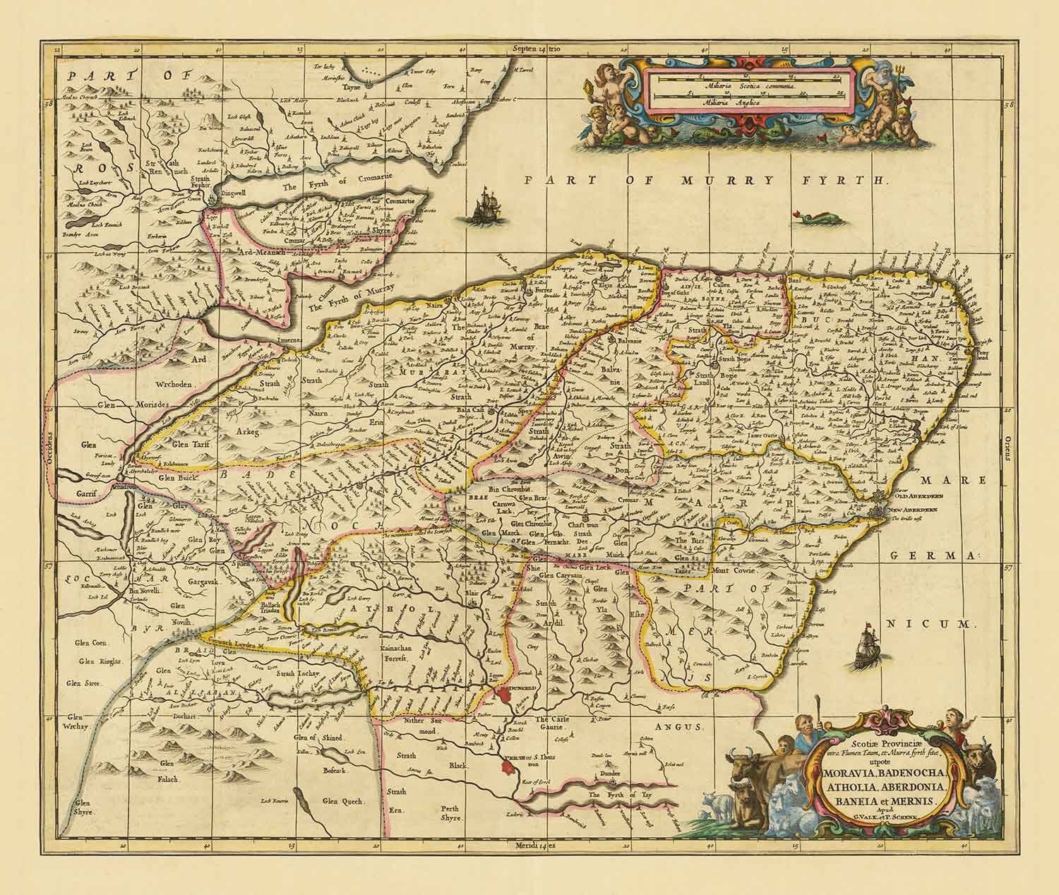 Diese reizvoll handkolorierte, detaillierte und äußerst seltene Karte von Inverness, Moray und Aberdeenshire wurde ursprünglich 1690 von Valk & Schenk veröffentlicht, einem Meisterkartographen-Duo, das im 17. Jahrhundert in Amsterdam arbeitete.