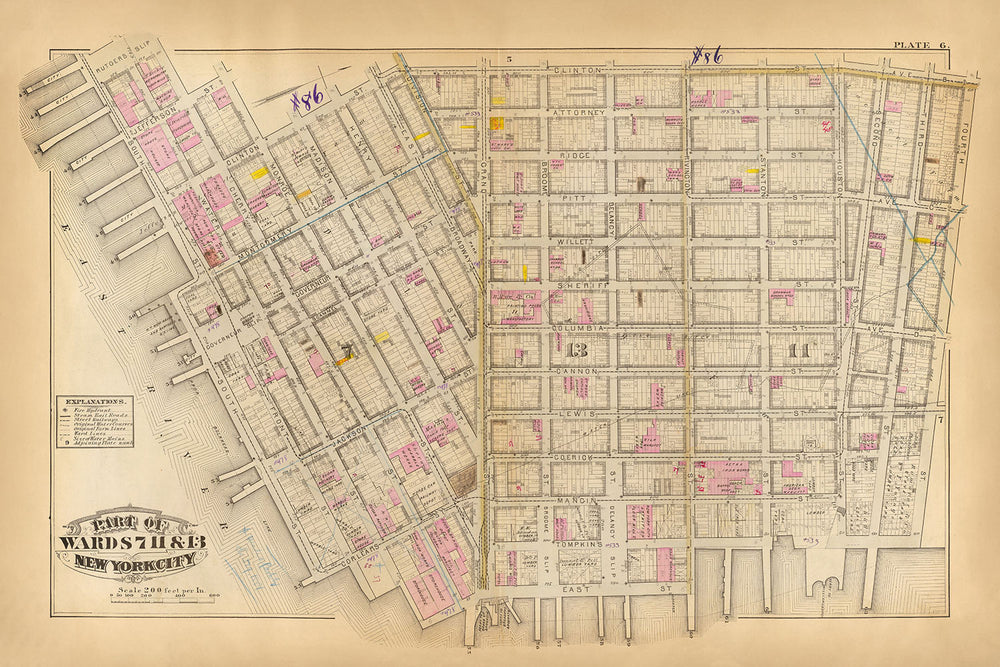 Besonders hervorzuheben sind die im Laufe der Zeit hinzugefügten Anmerkungen, die auf ein lebendes Dokument schließen lassen, auf das für verschiedene Zwecke verwiesen und es verwendet wurde. Diese Anmerkungen dienen als historische Fußnoten und geben uns Einblicke in die fortlaufende Erzählung der Stadtentwicklung. Die Karte zeigt auch Blockabmessungen und ermöglicht so eine detaillierte Ansicht des städtischen Rasters, das die Geographie der Lower East Side definiert hat.
