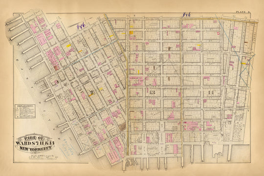 Diese handkolorierte lithografierte Karte stellt ein exquisites kartografisches Dokument aus dem späten 19. Jahrhundert vor und zeigt eine detaillierte Darstellung von Teilen der Bezirke 7, 11 und 13 in New York City, wobei sie insbesondere einen Bereich der historischen Lower East Side abdeckt. Diese 1879 von GW Bromley veröffentlichte Karte ist ein reichhaltiges visuelles Archiv des städtischen Lebens während einer transformativen Periode in der Geschichte der Stadt.