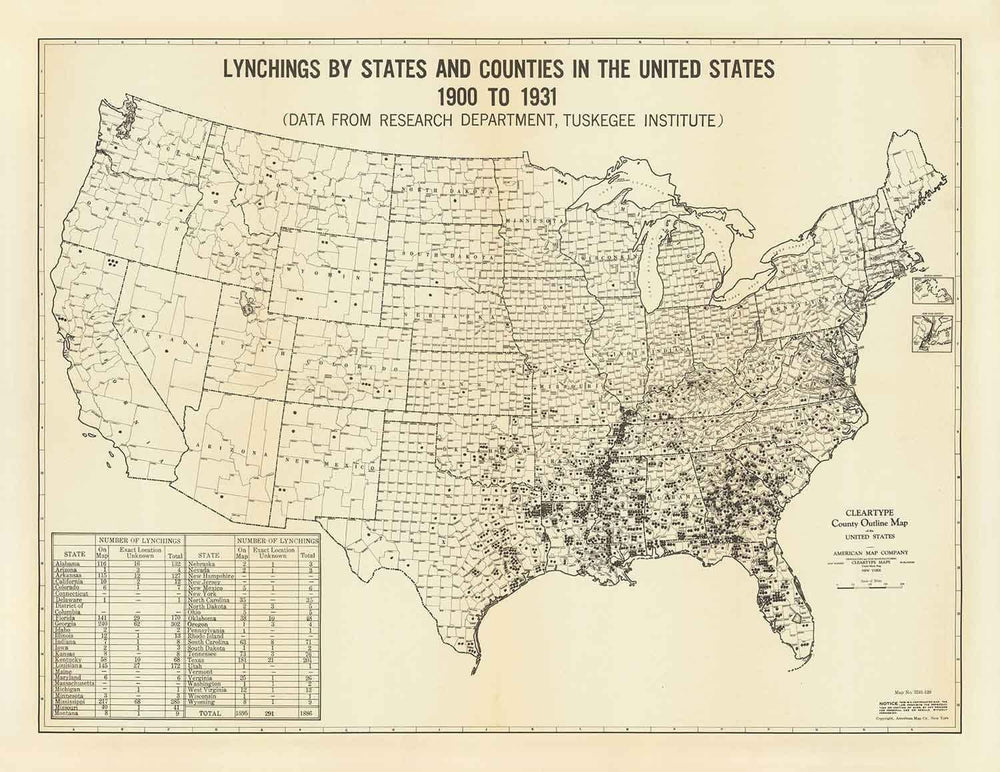 Eine wirklich erschreckende und wichtige Karte von 1.886 dokumentierten Lynchmorden in den Vereinigten Staaten zwischen 1900 und 1931, während des Höhepunkts der Jim-Crow-Ära. Die Daten wurden vom Tuskegee Institute gesammelt und von der CDSE und dem Projekt HAL verwendet.