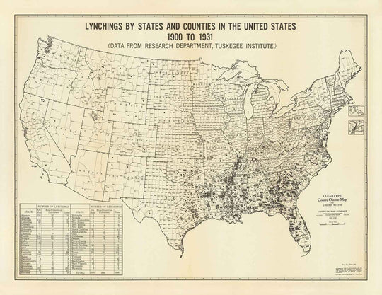 Alte Karte der Lynchmorde in Amerika, 1900-1931: Rassistische Ungerechtigkeit gegen Afroamerikaner, Tiefer Süden der USA, Jim Crow, KKK