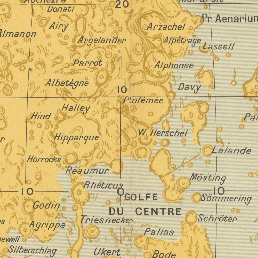 Nomenclature becomes narrative across the surface. Familiar mares—Mer de la Sérénité, Mer des Pluies, Mer des Crises, Mer des Vapeurs, Mer des Humeurs, and the evocative Golfo de la Mort—dot the disc like chapters in a chronicle of fire and impact. Labeled craters punctuate these plains and highlands, offering anchor points for both amateur stargazers and professional selenographers. By coupling poetic place-names with precise symbology, the map bridges myth and metric, making an austere celestial body invitingly human. That blend reflects Moreux’s broader preoccupations: education, popular science, and a curiosity about extraterrestrial life—threads that run through his lunar and Martian studies and animate this chart with intellectual reach.