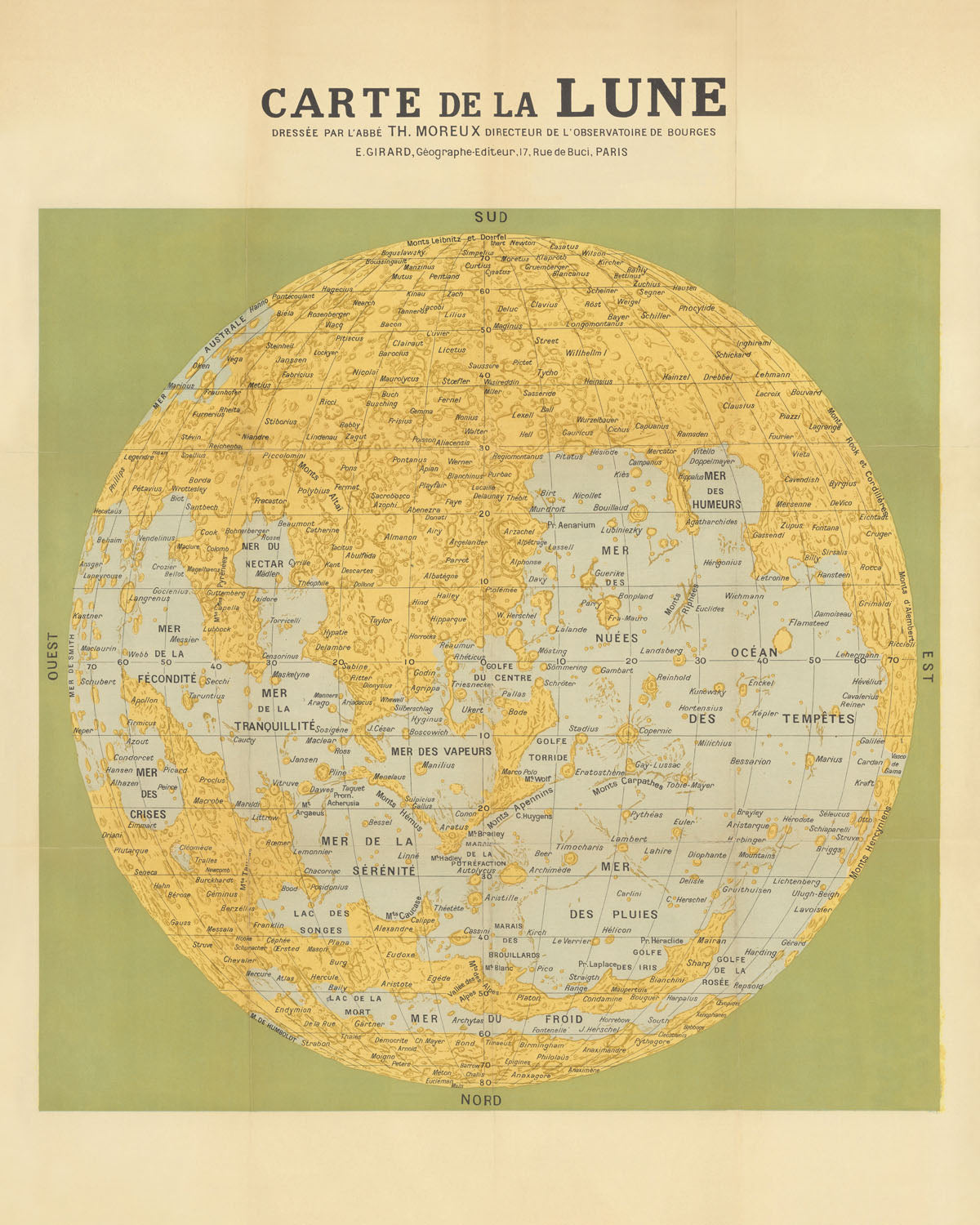 Théophile Moreux’s 1949 Carte de la Lune is a masterclass in mid-century lunar cartography: a chromolithographic portrait of the Moon’s Earth-facing hemisphere that fuses rigorous observation with luminous design. Its principal subjects are the maria and highlands, the summits and basins, and the great impact scars that narrate the Moon’s history. Moreux distills a complex three-dimensional world into an intelligible, elegant infographic, inviting the viewer to read relief as readily as text. The map is especially intriguing for how it frames pre-space-age knowledge—when only 59% of the lunar surface had been systematically charted—capturing both the certainty of well-known features and the tantalizing ambiguity at the edges of observation.