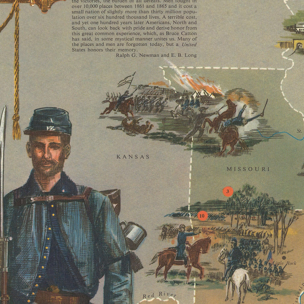 Created in 1960 by historian and bibliophile Ralph G. Newman, the 1861–1865 Civil War Centennial map is a richly detailed commemoration of America’s defining conflict. An ornate central cartouche sets a ceremonial tone, while ribbons and banners frame a densely informative field of pictorial vignettes. Across the United States—especially the Eastern and Southern theaters—illustrative markers pinpoint battlefields, naval engagements, and landmarks that shaped the course of the war. A chronological timeline marches along the margins, anchoring each image in time and helping viewers follow the cascade of events from 1861 to 1865. Portraits of prominent figures, paired with scenes of soldiers and equipment, weave biography, strategy, and memory into a single, cohesive visual narrative.