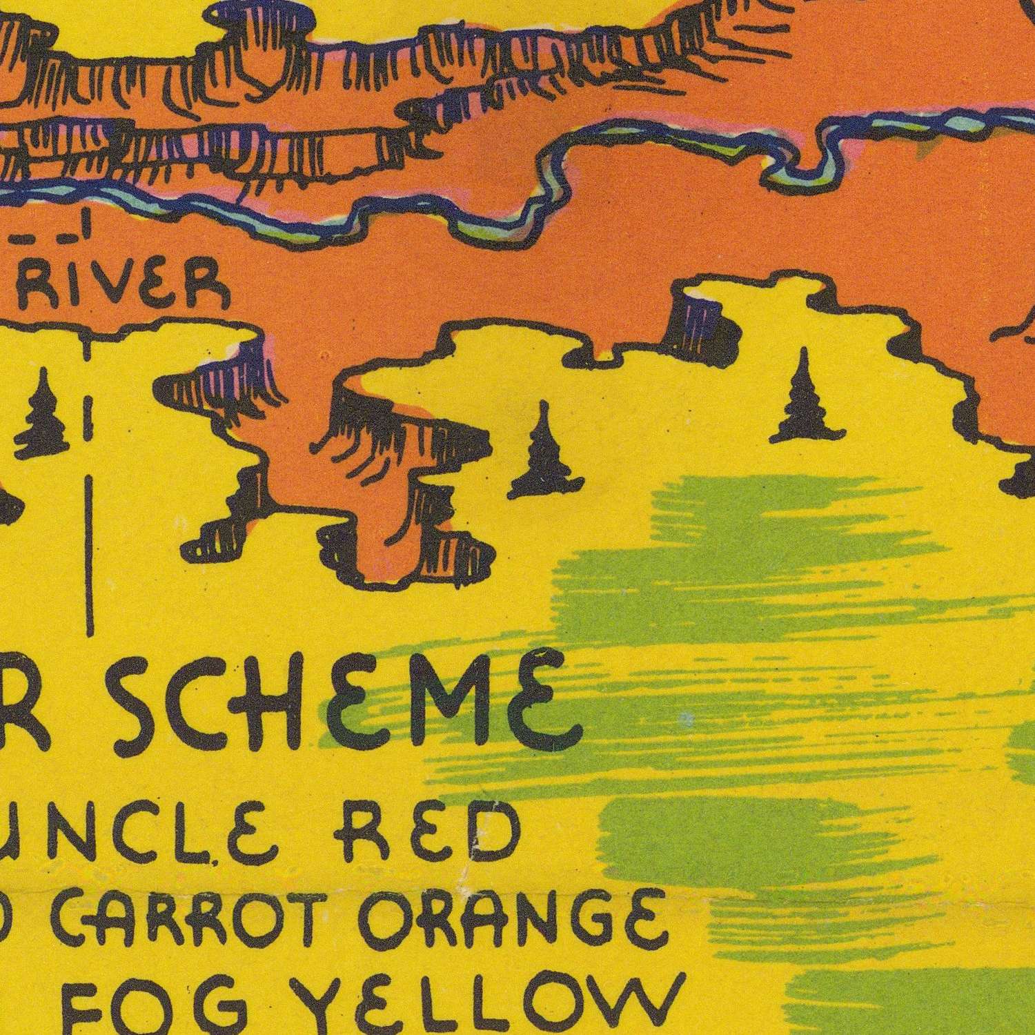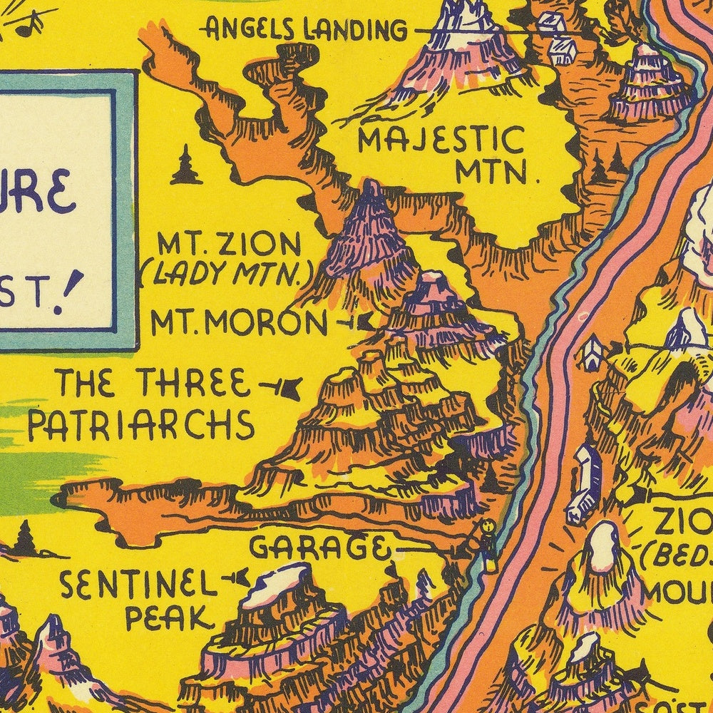 Across the sheet, Zion’s storied features parade in characterful vignettes. The steep spine of Angels Landing, the sentinel form of The Watchman, and the gleaming face of the Great White Throne stand in cheerful conversation with the Temple of Sinawava and the West Temple. The Virgin River—joined here by the Mukuntuweap River—winds through the terrain toward Parunuweap Canyon, its sinuous course made instantly legible by playful, winding strokes. Peaks like Eagle Crag and Sentinel Peak, the sweep of the Horse Pasture Plateau, and the threefold silhouette of the Three Marys Peaks are each called out with a wink. Even the color key is a performance, offering “carbuncle red” and “oodles of green” to mirror the canyon’s saturated palette.